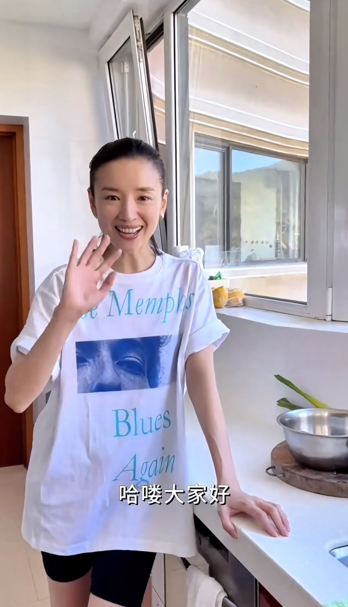 董洁衣着休闲,大T恤搭配短裤,露出一双细腿,身材保持的很完美。她扎着头发对镜笑得十分开心,说要给大家展示如何做带鱼,还邀请了父亲。