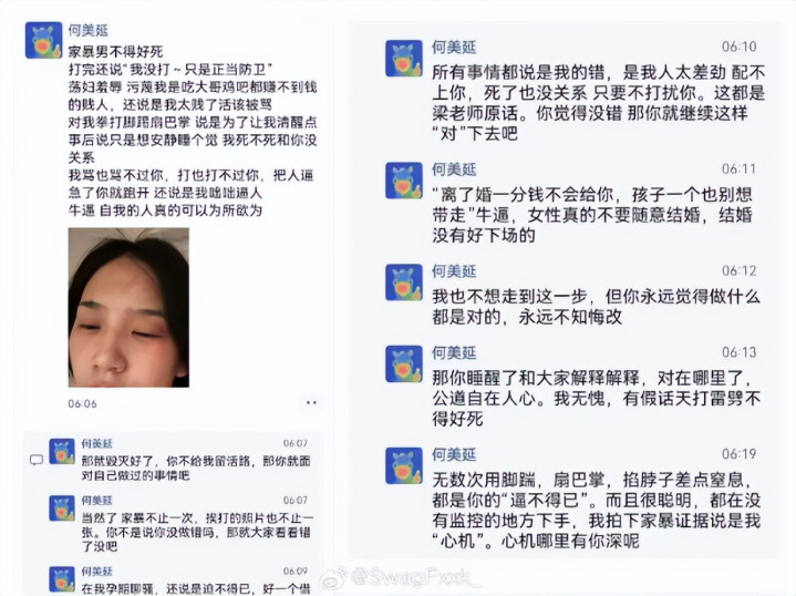 在今年4月份时,何美延就在社交平台上发布照片,控诉梁淞家暴,孕期撩骚以及言语羞辱等行为,甚至闹到警察上门调解。