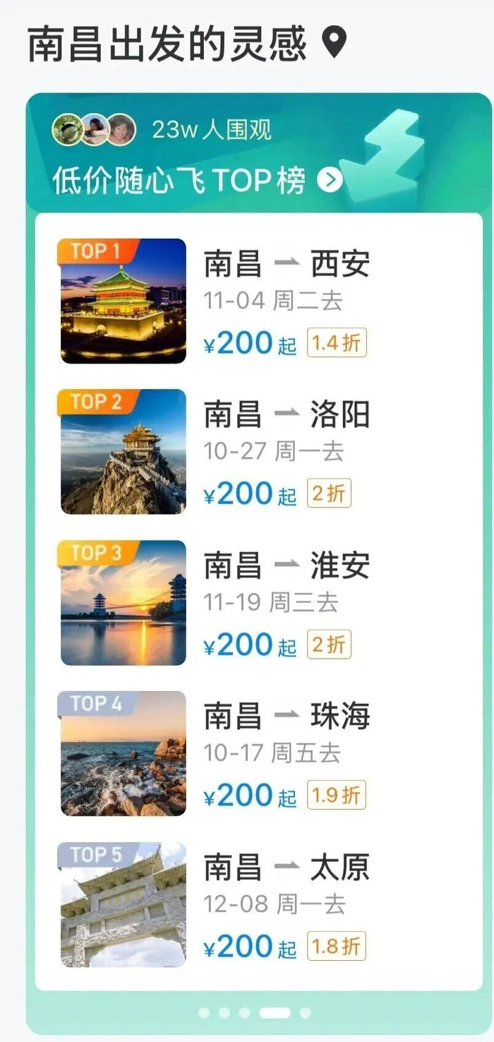 10月中下旬至11月上旬,南昌飞往西安、洛阳、珠海、太原等地,机票最低可至1.4折。
