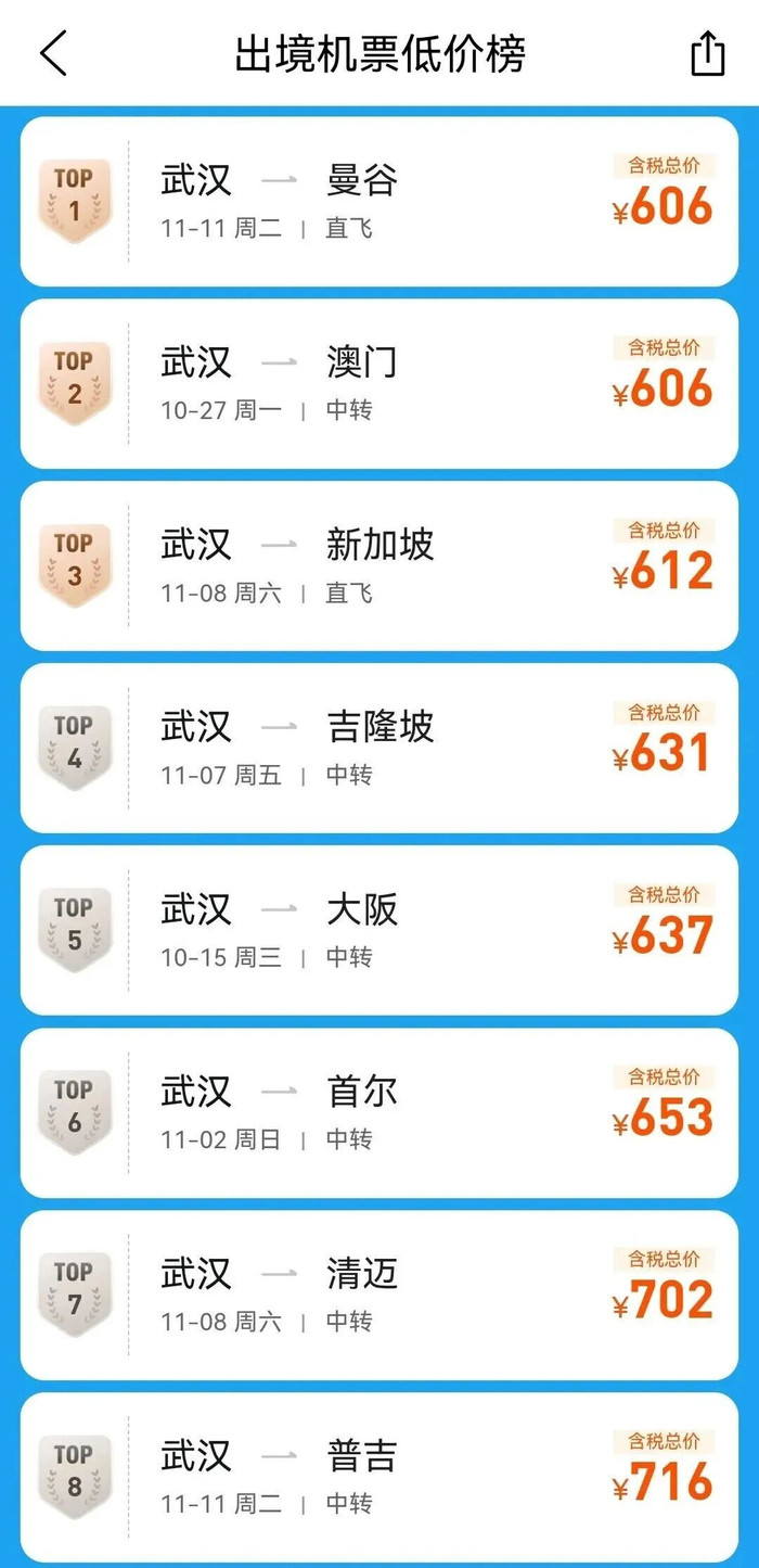 出境游方面,机票也出现了不同程度的降价。武汉出发前往曼谷、新加坡、吉隆坡、大阪等旅游地区的最低票价都在600元上下。