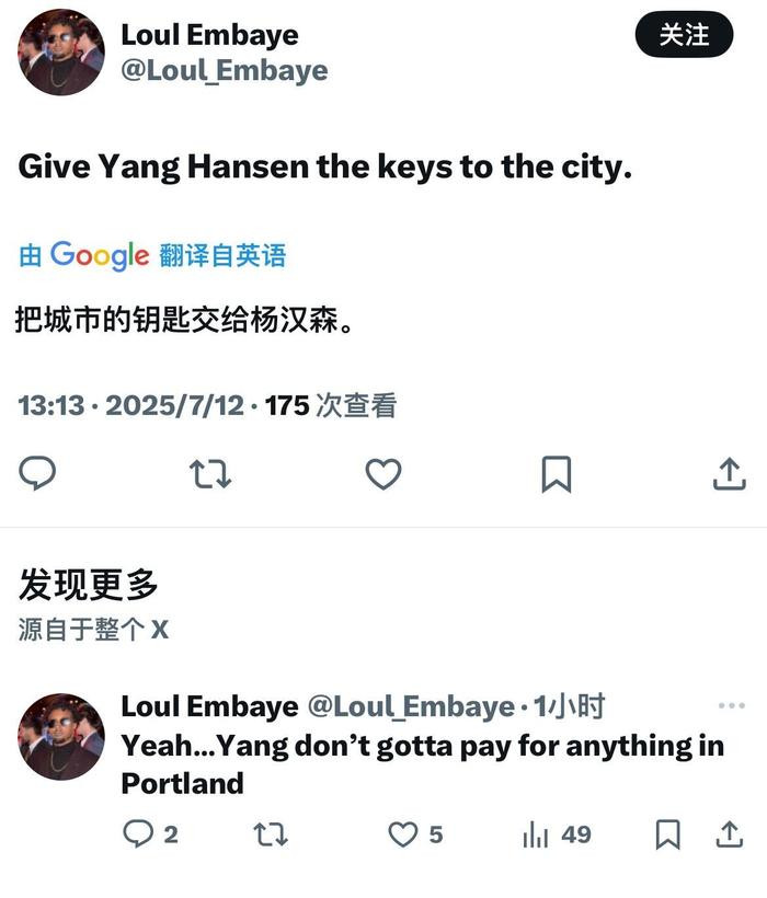 波特兰本地人已经激动到要免去杨瀚森在这座城市里的一切花销了,但杨瀚森在首秀的表演,还远没有结束。