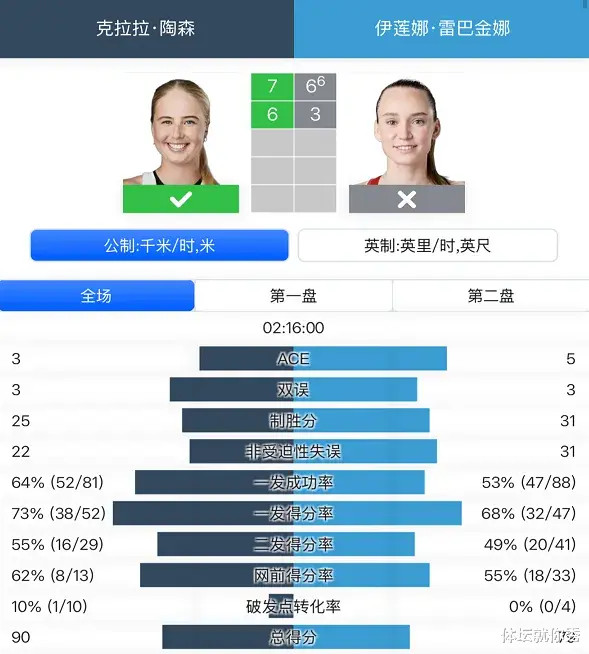 而在第二盘比赛,莱巴金娜则是彻底被对手打蒙了,尽管第2局挽救了2个破发点,但最终还是被破发,开局就是0-3落后。此后两人各自保发,比分的差距一直是3局,莱巴金娜并没有获得什么破发的机会,最终凭借着仅有的一次破发机会,陶森以6-3再胜一盘!就这样,陶森大比分2-0横扫前温网冠军,强势跻身温网的16强,也首次进入到世界前20!这场比赛,也是陶森首次击败莱巴金娜,赛后的数据统计方面,虽然在制胜分上比莱巴金娜少了6个,但是在非受迫性失误方面,陶森也少了9个,对失误控制的更好。同时在发球方面,陶森在一发和二发方面,都做的比莱巴金娜更好,今天的莱巴金娜,完全是不在状态,要想在比赛中获胜,这显然是不够的!随着温网冠军的出局,女单16强也产生了,这次16强的名单中,只有4位前10的种子选手,这样的结果恐怕很多球迷和媒体,都是没有想到的,而今年的温网,也将注定会产生一位新的冠军选手!
