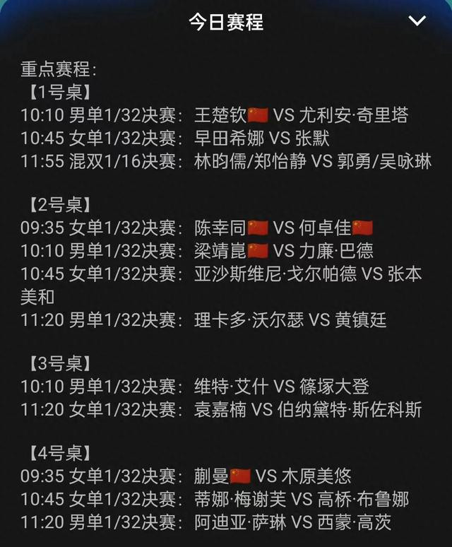 中国乒乓球队,王楚钦、陈幸同、何卓佳、梁靖崑、蒯曼将会出战1/32决赛。