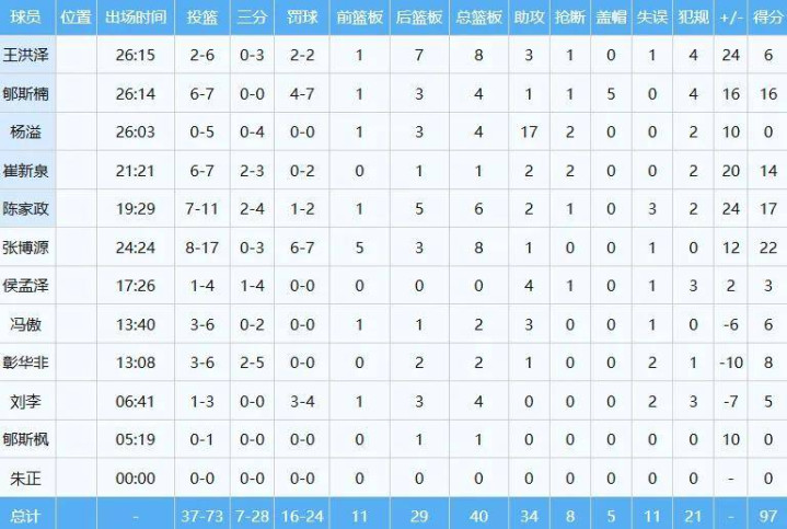 中国队4人得分上双,首发出战的杨溢26分钟里狂送17次助攻且0失误,张博源轰下全场最高的22分外加8板,郇斯楠16分4板5帽进账,崔新泉14分,陈家政17分6板2助。