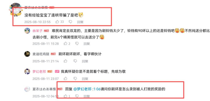 再看这层评论更绝,上面说“没有经验宝宝连哄带骗了”,下面又说“请问我刷环,视频1分06秒怎么录到被别人打败的奖励的”。你这意思不就是我也去打PK了,还打失败了呗。