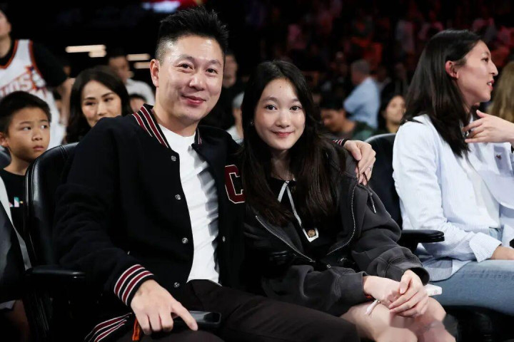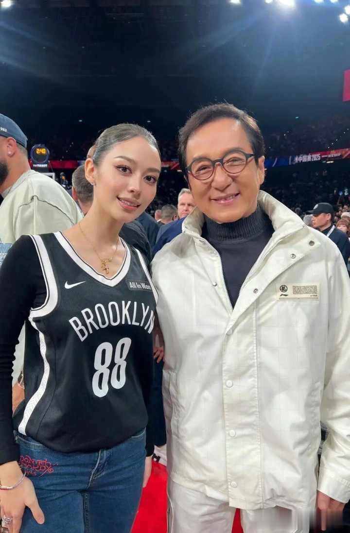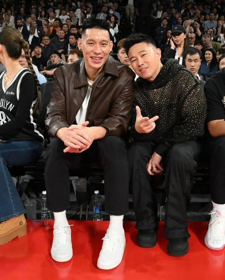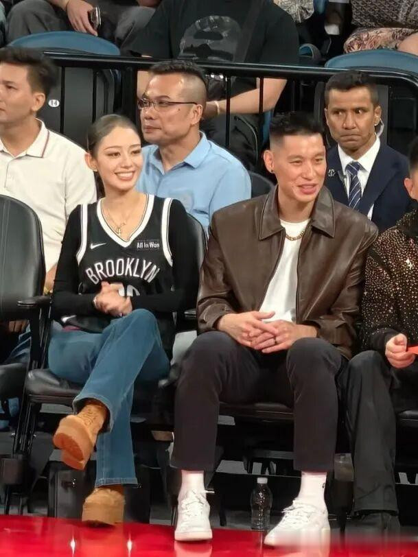 再看一位养眼的,郎朗的妻子吉娜,身穿篮网队的周边队服,坐到了林书豪边上。