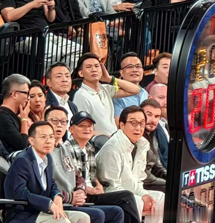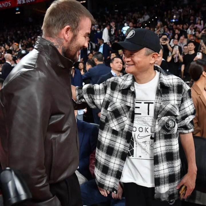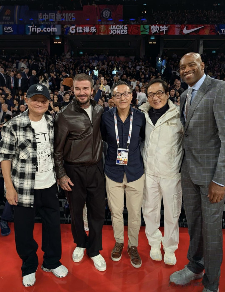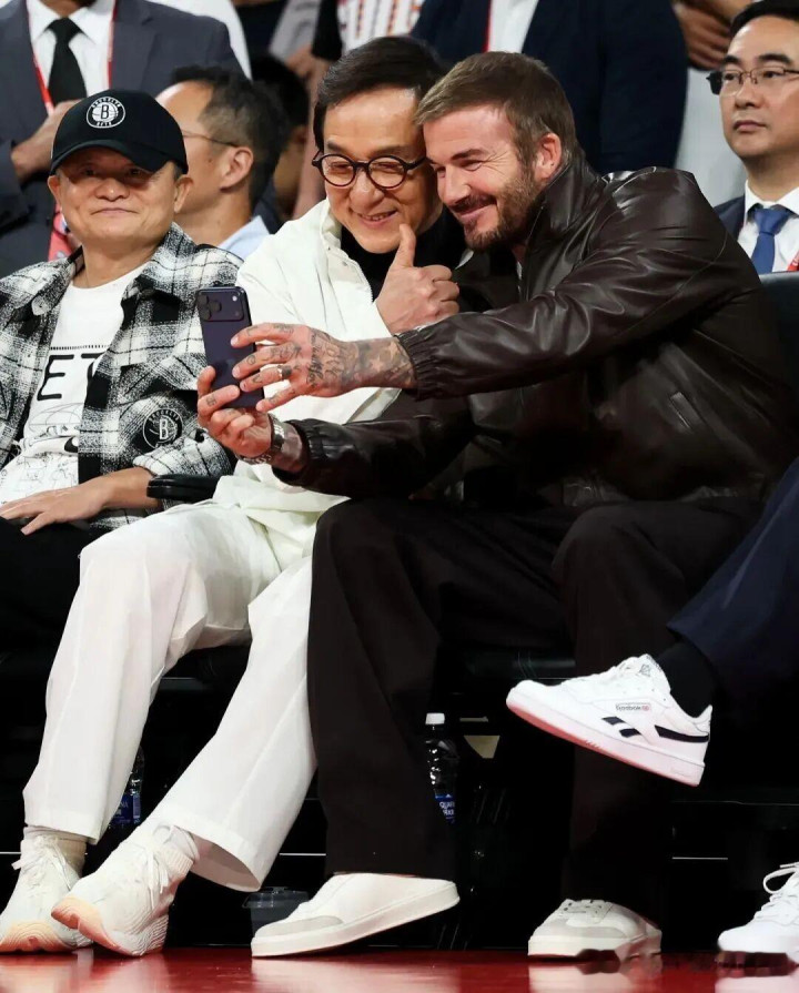 只是马云再潮,也拗不过身边坐了两个“显眼包”,成龙老大哥和贝克汉姆。