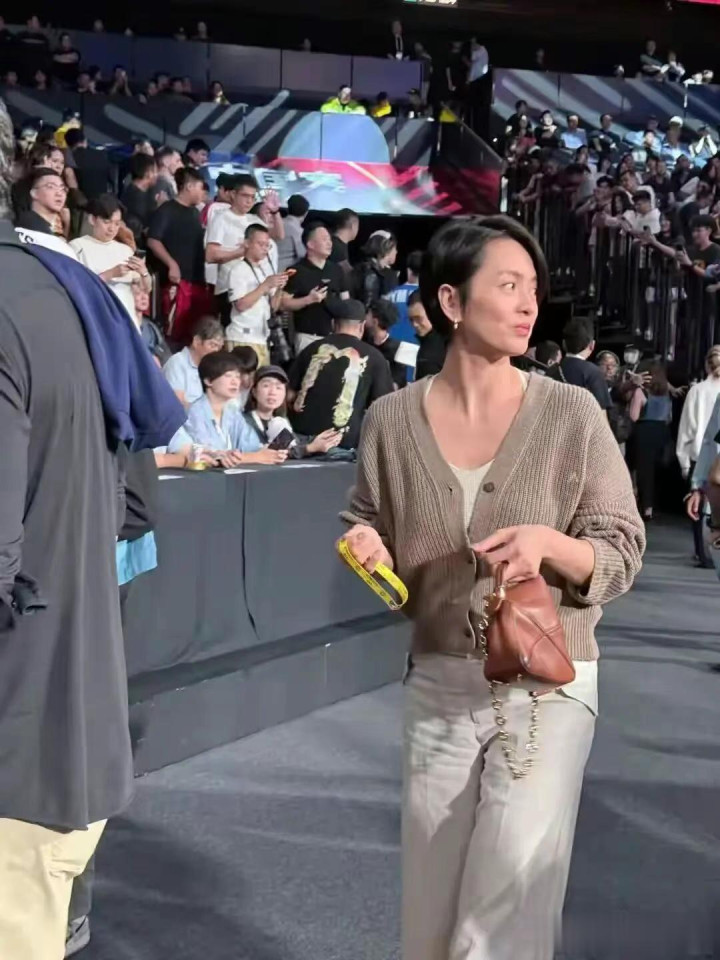 比起吉娜的狂热,另一边梁咏琪就像是出门遛弯,顺便来看看比赛的观众,深浅搭配得当的棕色系穿搭,很有秋冬的美拉德气息。