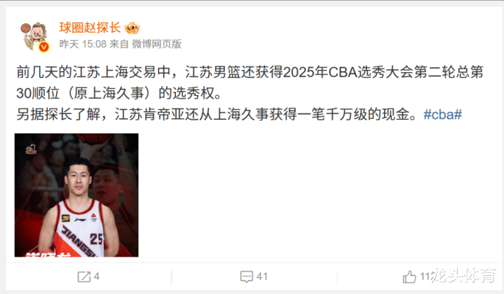 根据@球圈赵探长透露,江苏队在和上海队的交易中,还获得了一笔千万级的现金,和2025年CBA选秀大会第二轮总第30顺位的选秀权,这个选秀权其实相当于是白送,去到30顺位基本已经没有什么好的球员可以选择了。